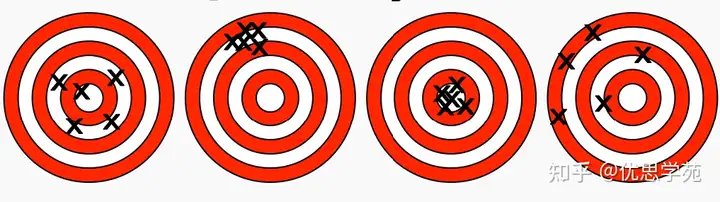 以下这张图片生动地展示了精确性和准确性之间的区别,分别有四个靶子,每个靶子上有不同的命中点分布。