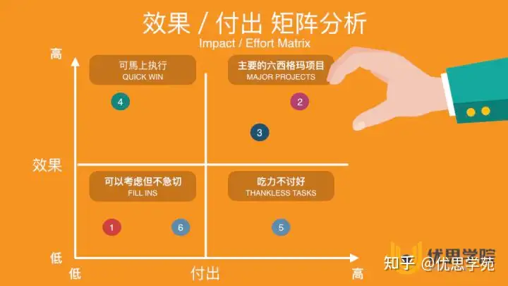 在优思学院的课程,我们介绍了个重要和关键的项目选择工具,也就是效果/付出矩阵分析,作为六西格玛项目选择的方法: