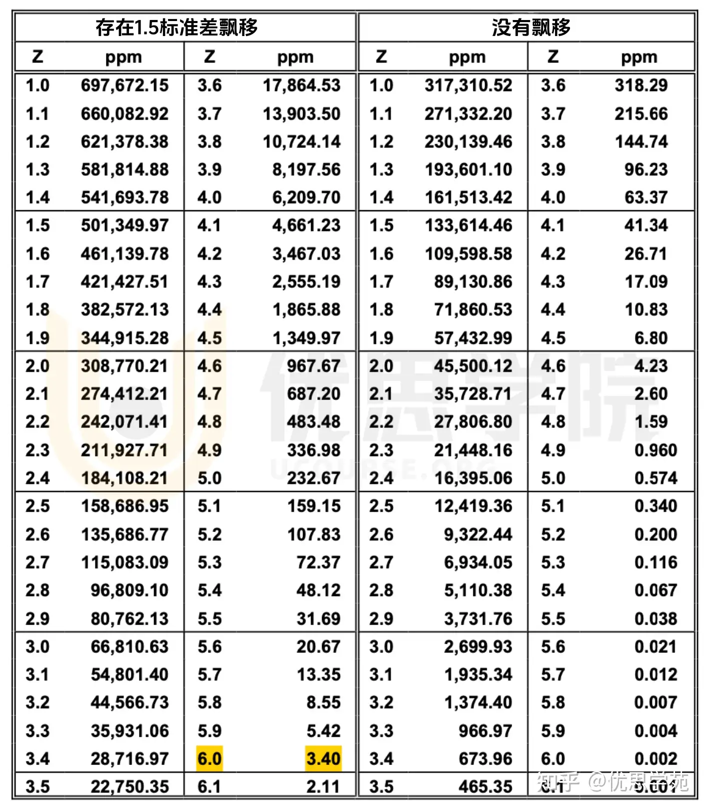 然而,现代六西格玛管理中普遍接受的标准是每百万次操作中允许3.4个缺陷,而非严格的0.0000002%的缺陷率。这是因为在实际操作中,长期过程平均值往往会发生1.5个西格玛的偏移。这一现象是摩托罗拉公司在大量实证分析中发现的,即过程在短期内表现较好,但在长期内因特殊过程变异导致实际水平下降。