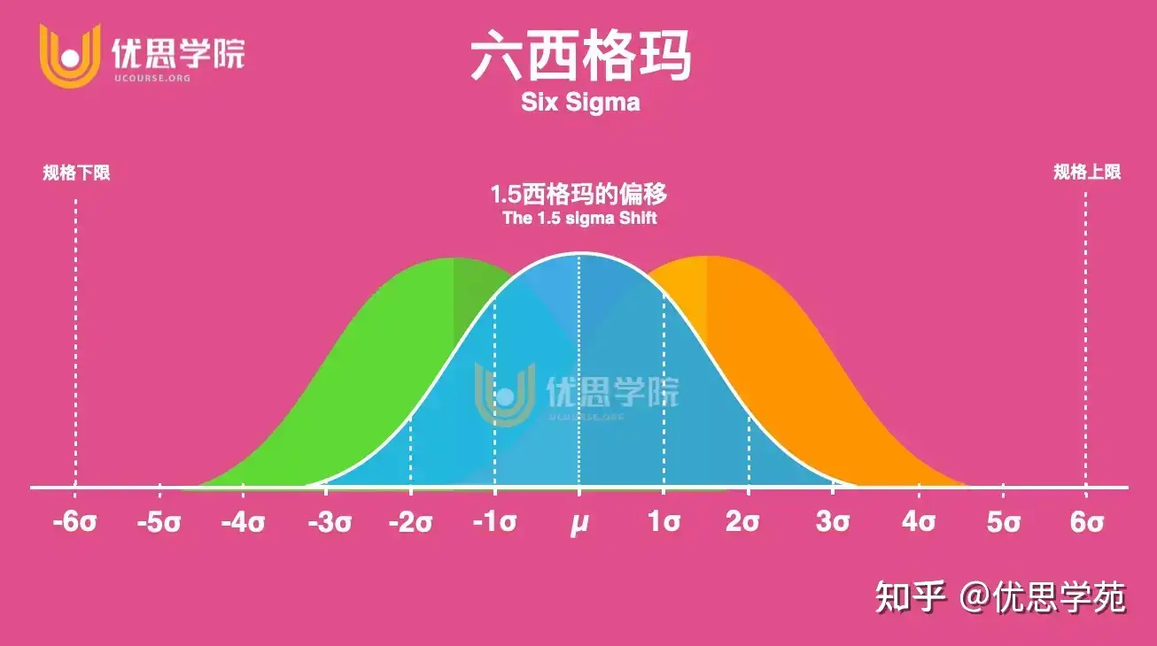 1.5西格玛偏移是指在实际操作中,长期过程平均值可能会向任意一侧偏移1.5个标准差。为了应对这一现象,六西格玛管理允许过程在长期内发生这种偏移,从而确保缺陷率保持在百万分之3.4以内。