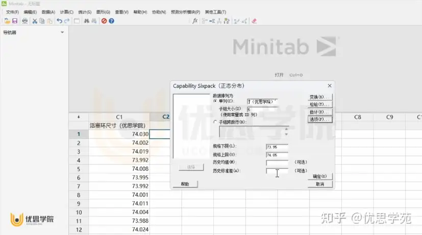 在数据列选择中,他们输入“直径”。 在子组大小栏中,他们填入数字“5”。 在规格下限栏中,他们输入“73.95”。 在规格上限栏中,他们输入“74.05”。 点击“选项”后,他们在目标值栏中输入“74”,然后在每个弹出的对话框中都点击了“确定”。