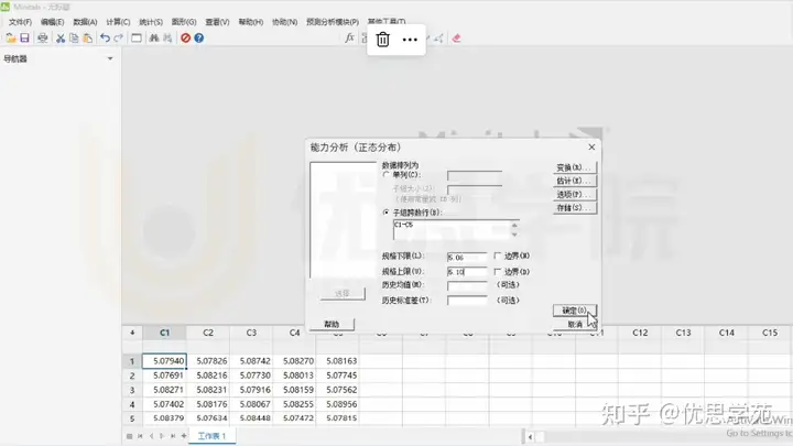 现在,我们来示范一下如何用Minitab处理这些数据和取得Cpk值。