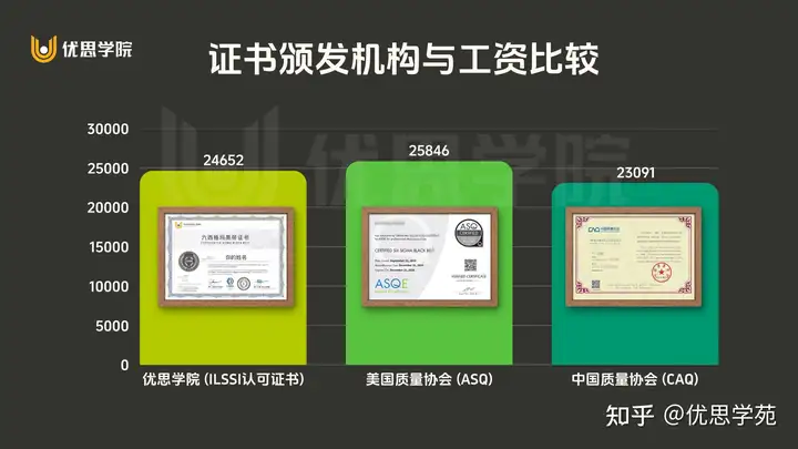 很多人关心,不同机构颁发的六西格玛证书含金量会不会不一样?从数据来看,答案是否定的。无论是 优思学院(ILSSI认证证书)、美国质量协会(ASQ),还是 中国质量协会(CAQ),持证者的平均工资水平差距并不大,都在相近区间内波动。