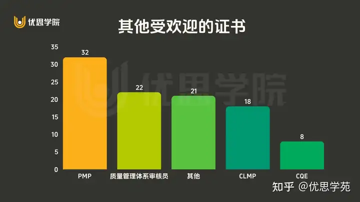 受访者中证书以来自优思学院和CAQ为多,合计占比超过60%。(此分布仅指代表受访者的分布,而不一定能代表全国的实际分布。)